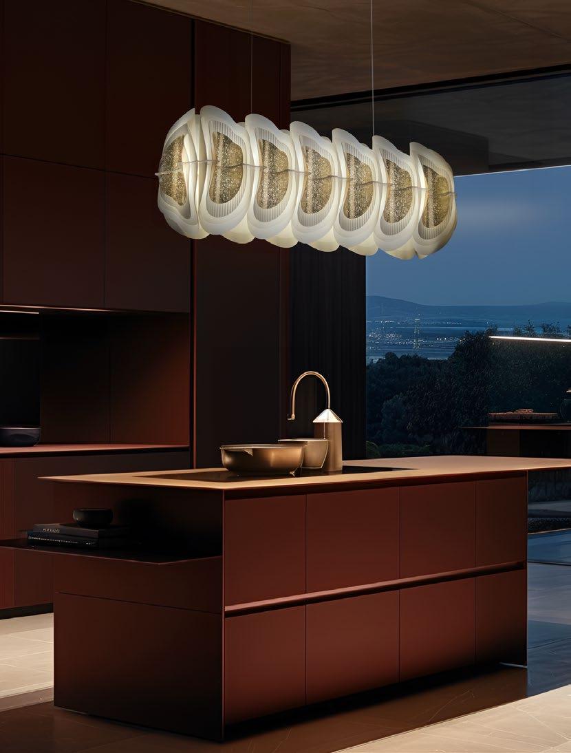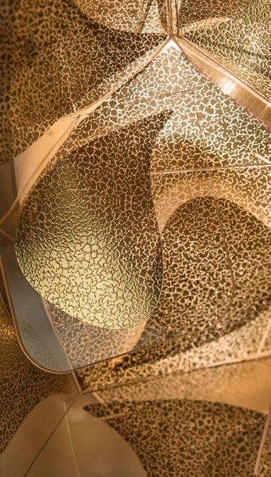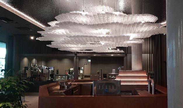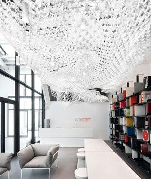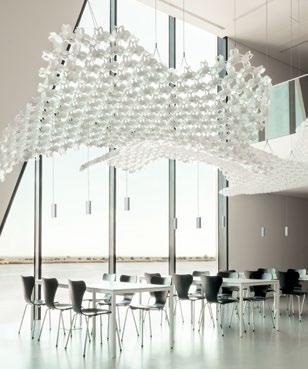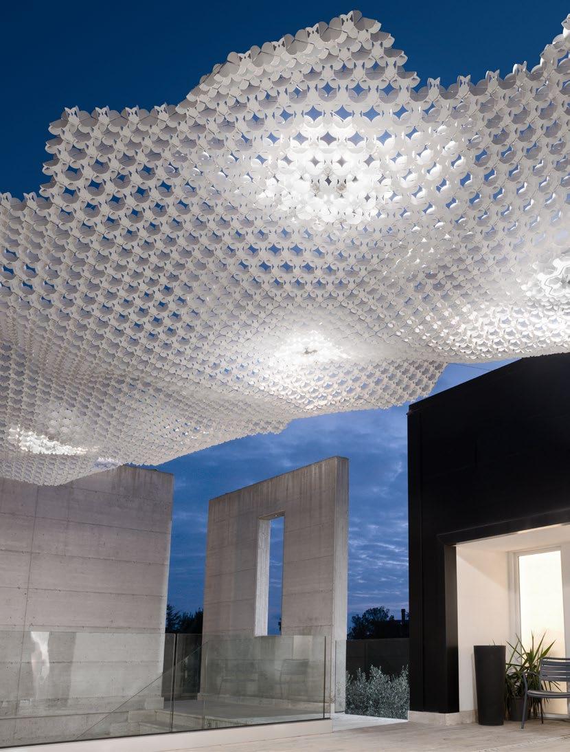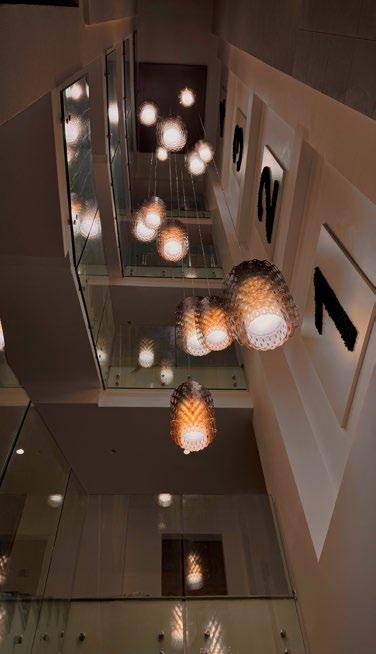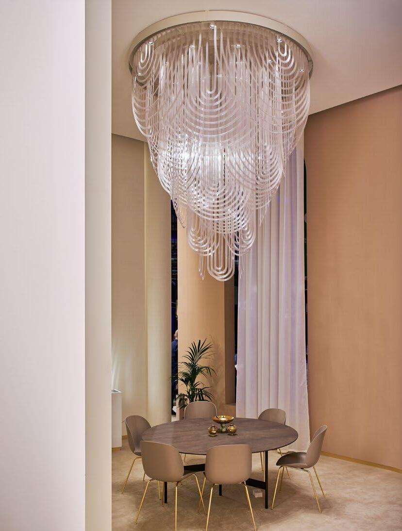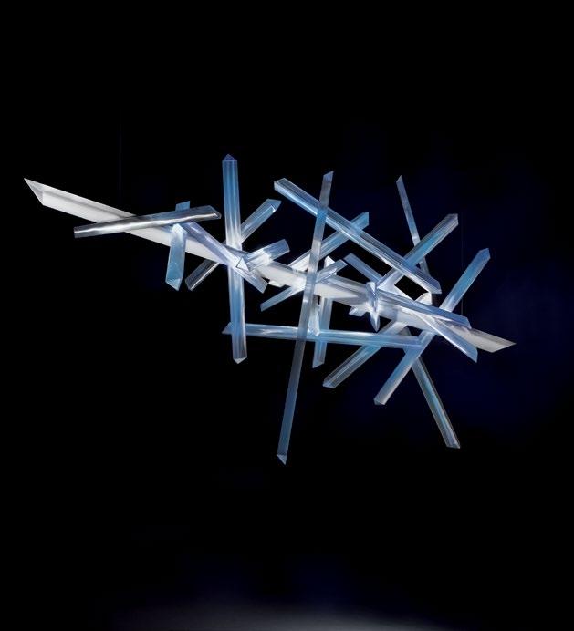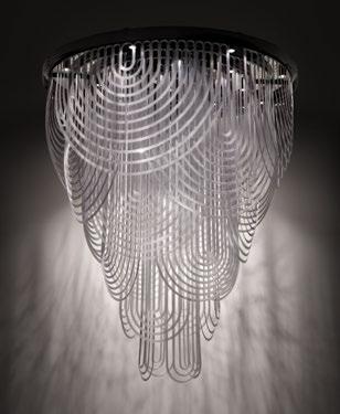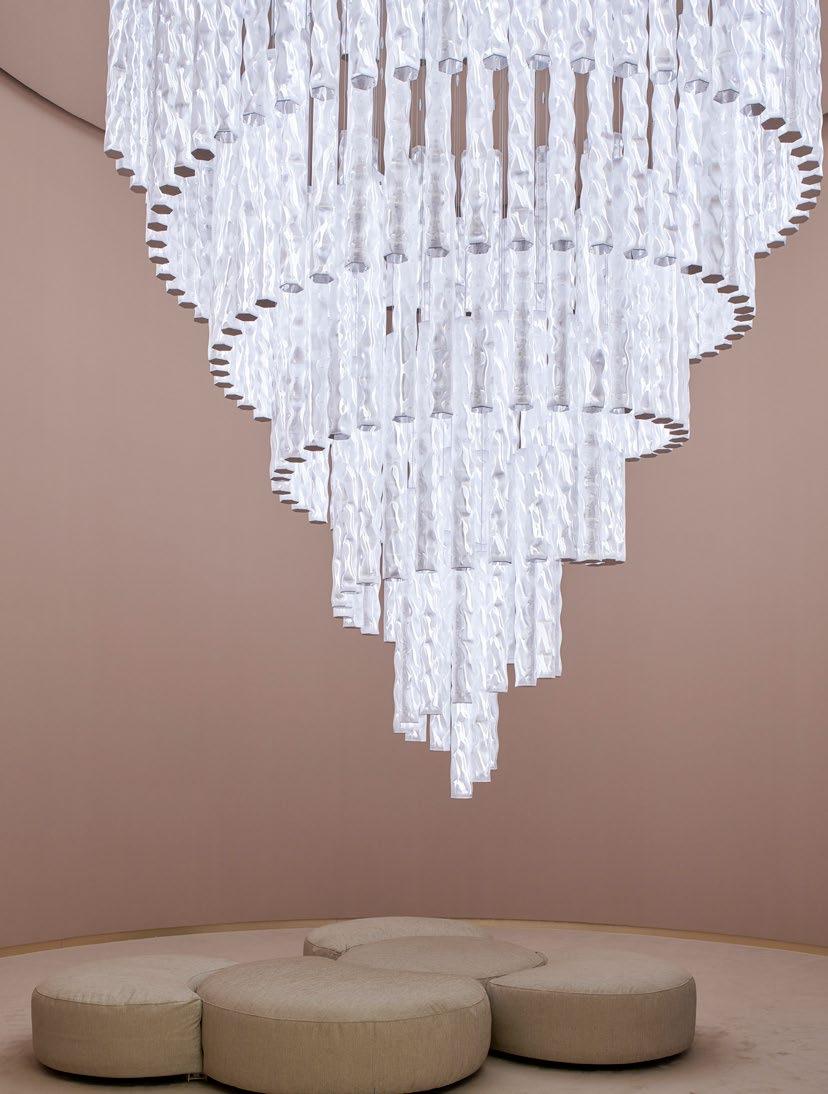 The illuminated modular system sinuously undulates throughout a space with diverse polycarbonate layers that in the lamp’s highest points, reach two meters of visionary fluidity.