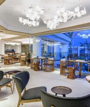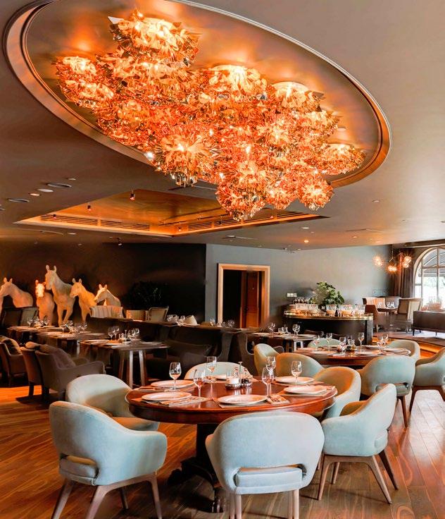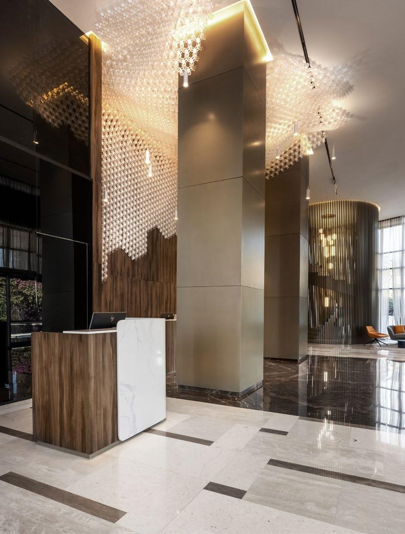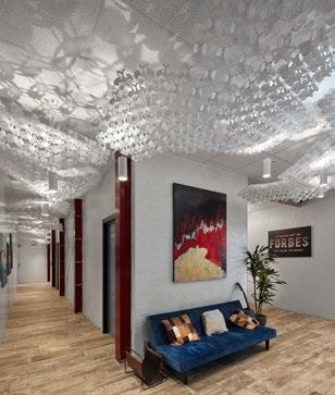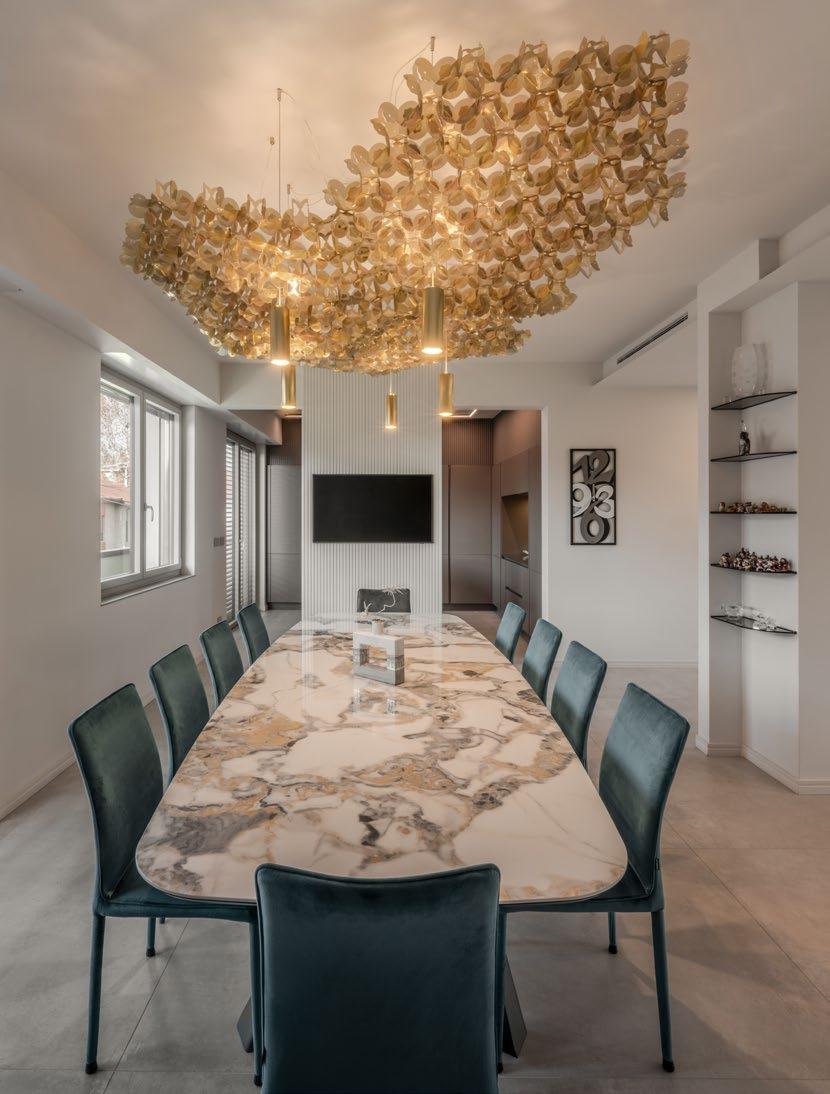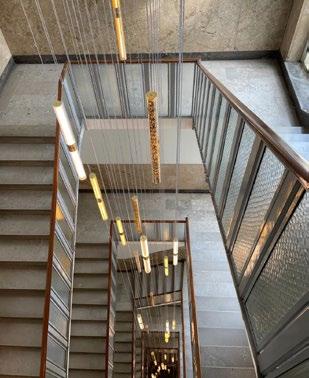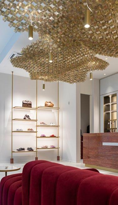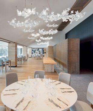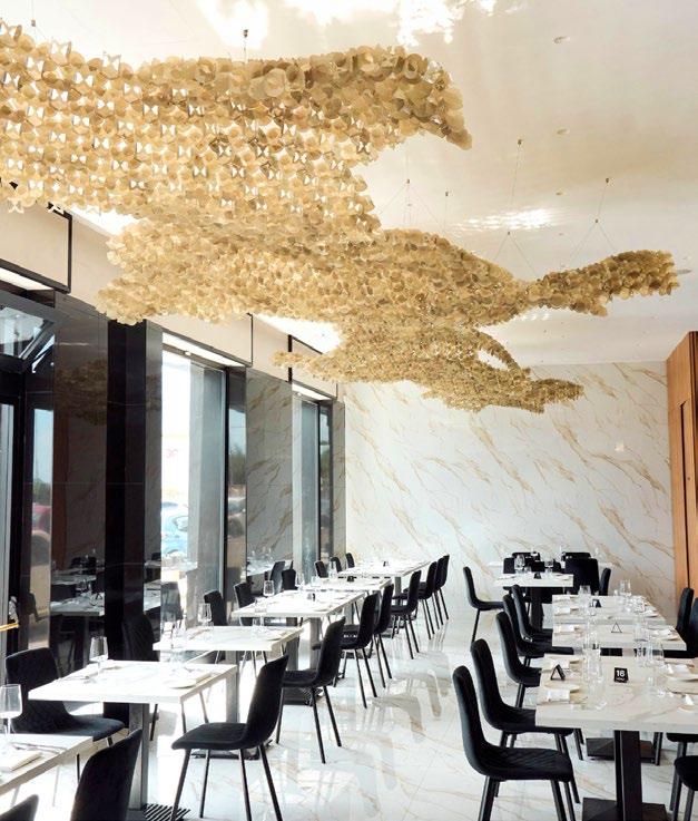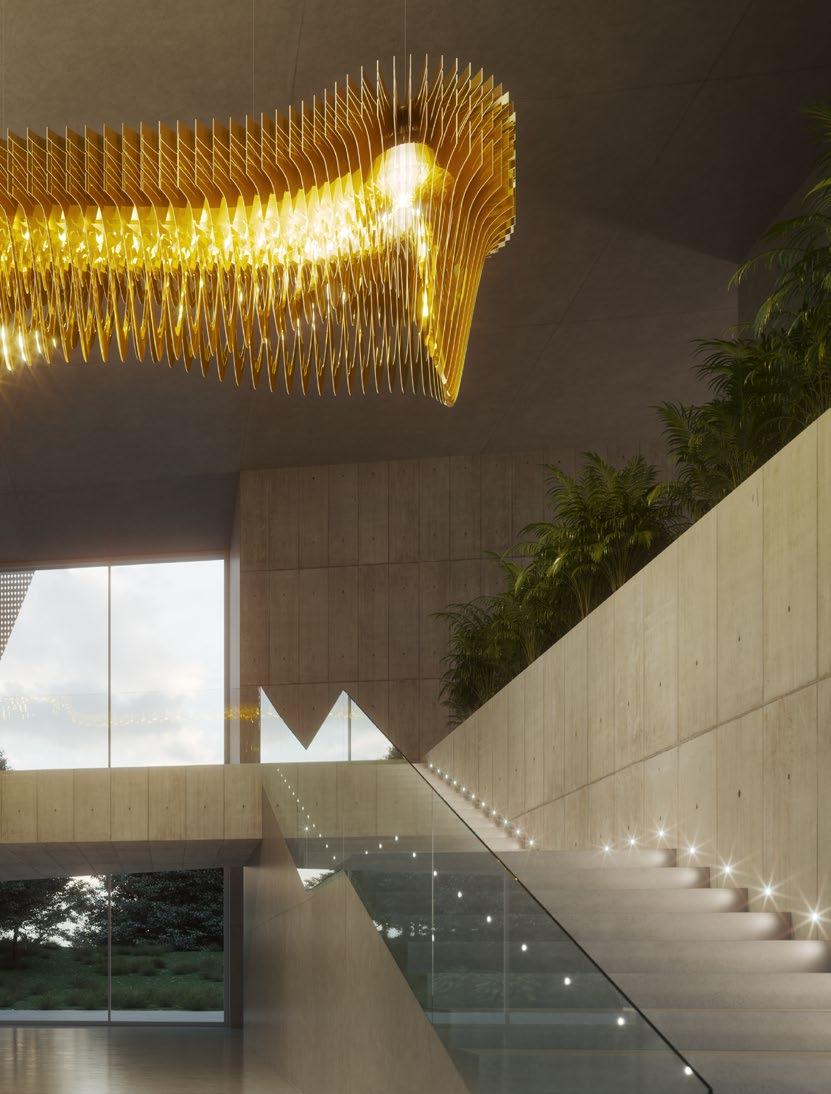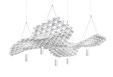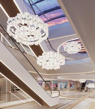 The illuminated modular system sinuously undulates throughout a space with diverse polycarbonate layers that in the lamp’s highest points, reach two meters of visionary fluidity.
