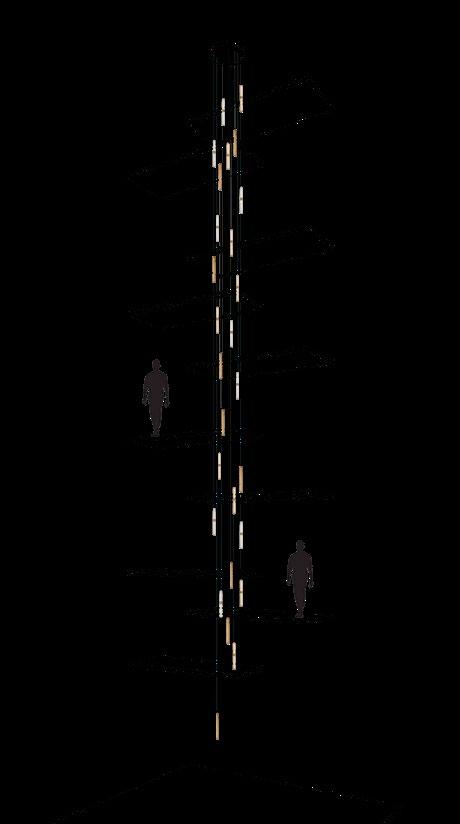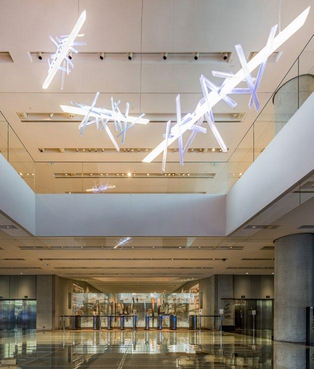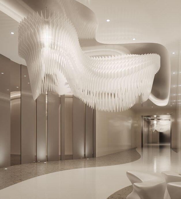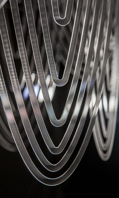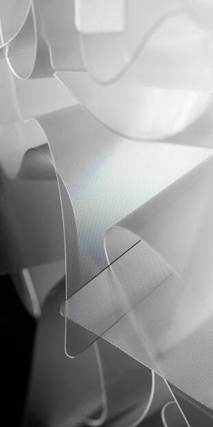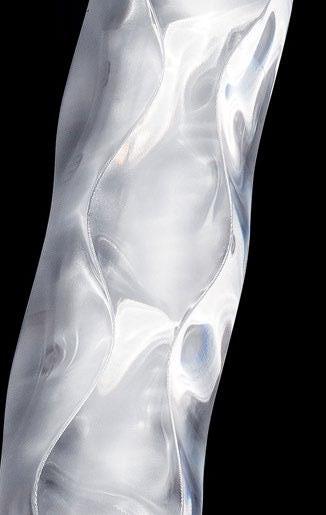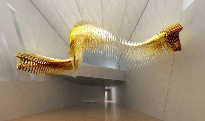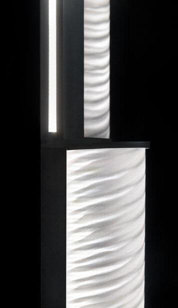La scultura luminosa è composta da un corpo illuminante modulare che crea onde sinusoidali nello spazio, avvolta da layer in policarbonato tutti diversi fra loro.
