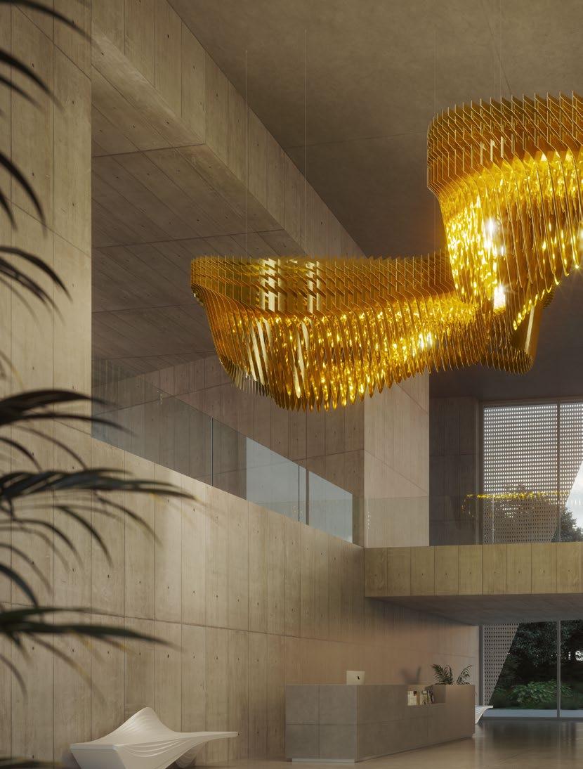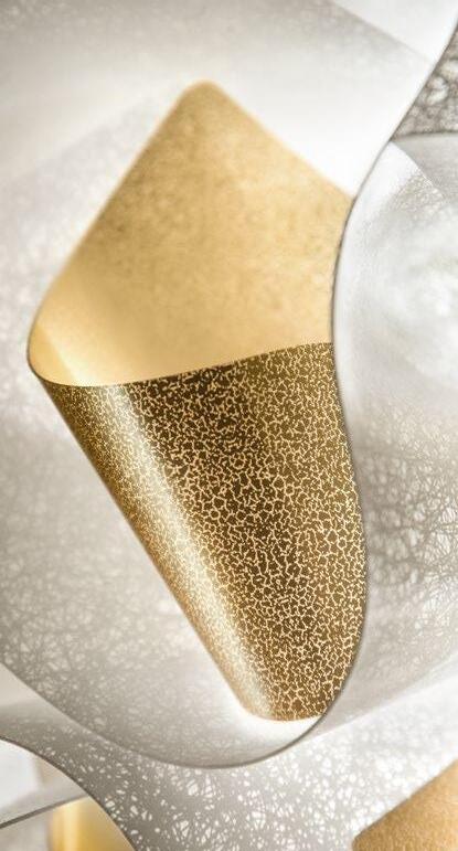 To celebrate the 10th anniversary of Slamp’s collaboration with Hadid Design Studio, Zaha’s iconic 2013 Aria takes on new form in a modular version. The illuminated modular system sinuously undulates throughout space with diverse polycarbonate layers that in the lamp’s highest points, reach two meters of visionary fluidity. The lamp’s ever-evolving points of view are the fruit of careful research focused on how Lentiflex® enhances and liquifies illumination. Available in both total white and gold finishes: the elements are metallized through a process where an aluminum bar is vaporized in a hyperbaric chamber. The Slamp Team can customize solutions to any space, working alongside designers.