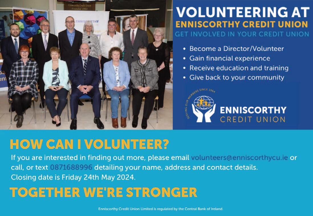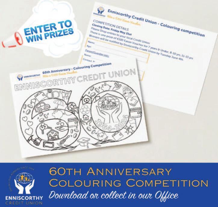 We also wish continued success to Enniscorthy Credit Union which is celebrating 60 years of service this year. Check out our pictorial coverage on pages 28-29.