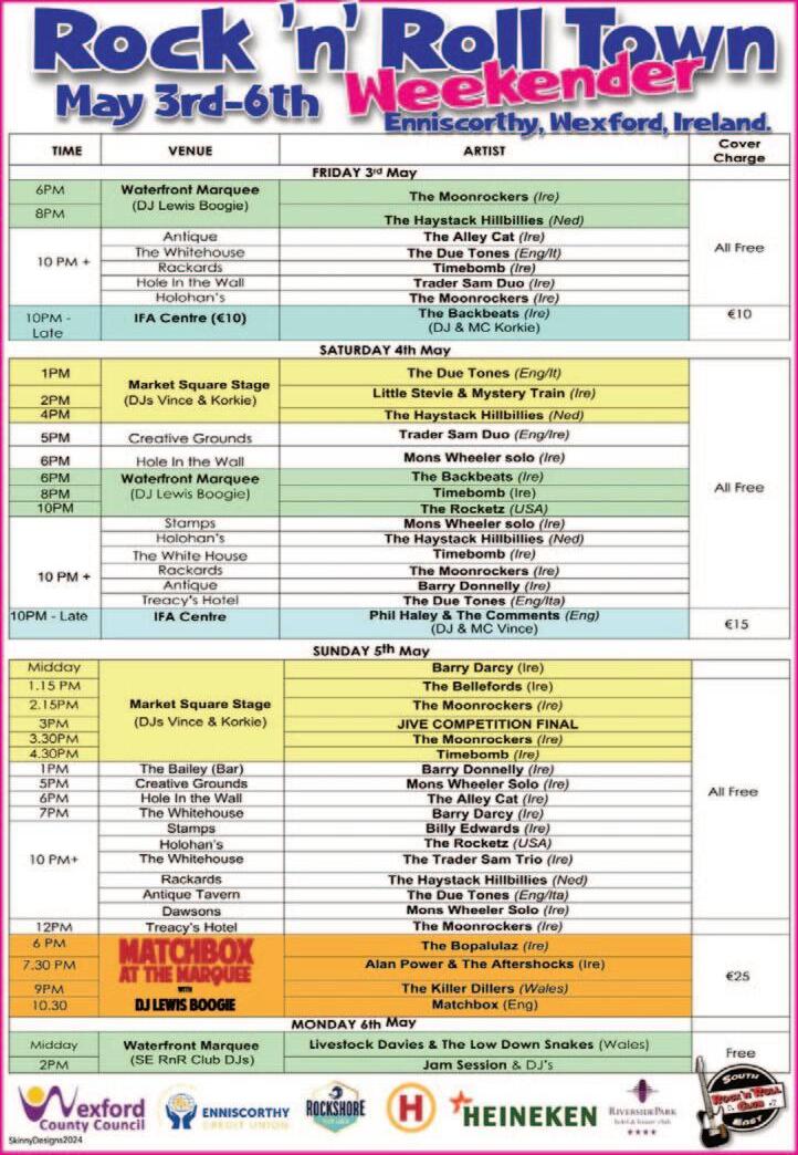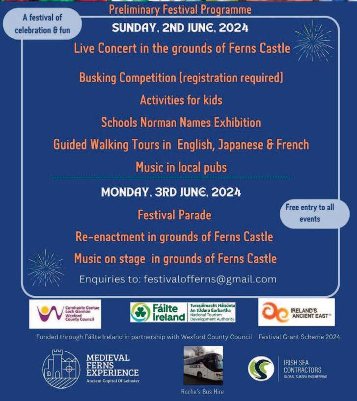 Welcome to the May issue of the Slaney News. Enniscorthy’s festival season kicks off in style this May bank holiday weekend with the Enniscorthy Rockin’ Food & Fruit Festival and the Rock ‘n’ Roll Weekender both taking place. We carry substantial coverage in this issue particularly on pages 12-15. In a month’s time, it’s the turn of the Enniscorthy Street Rhythms Festival, and then in July the village at Wheelock’s hosts its Wexford Strawberry Weekend, and in August the All Ireland Fleadh Cheoil comes to Wexford town with Enniscorthy set to benefit from plenty of Fleadh-related activity. So definitely lots to look forward to over the summer and hopefully some good weather too!