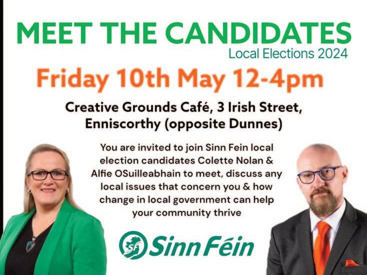 We are 5 weeks away from the elections, and we would love to meet you all. Please join us on 10th May from 12 noon to 4pm in Creative Grounds, Enniscorthy.