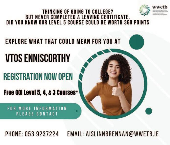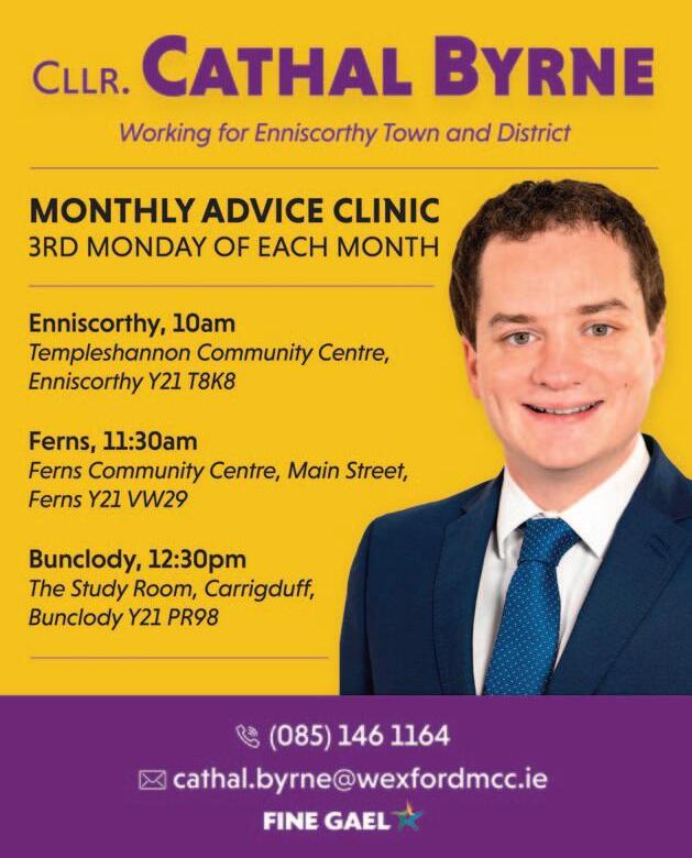 ● WasteWater Solutions –24 Hour Service ● Maintenance & Servicing of Septic Tanks and Treatment Systems ● Pump and Parts Sales ● Fully Insured Ballygillistown, Davidstown, Enniscorthy. Email: matt@enviropaktreatmentsystems.com www.enviropaktreatmentsystems.com Phone: 087 2338913 / 087 6343976 This size ad can be yours for just €50+vat. Telephone Frank at 087-2403310 for more details. Senator Malcolm Byrne If I can help in any way please let me know. Tel: 085-8245142 malcolm.byrne@oireachtas.ie Holding clinics on the last Saturday of every month: BUNCLODY Redmond’s Bar 2.00pm to 2.45pm. FERNS Ferns Community Centre 3.00pm to 3.30pm. CAMOLIN Jack’s Tavern 3.45pm to 4.15pm. KILMUCKRIDGE Upton Court Hotel 4.30pm to 5.00pm
