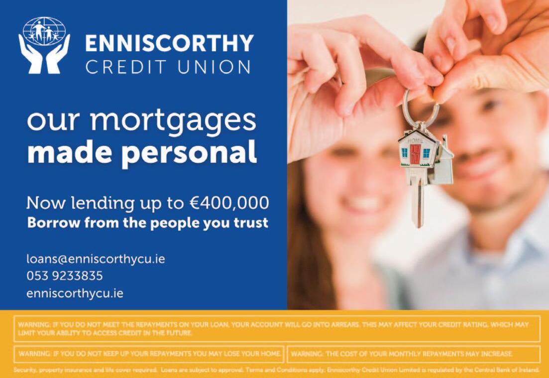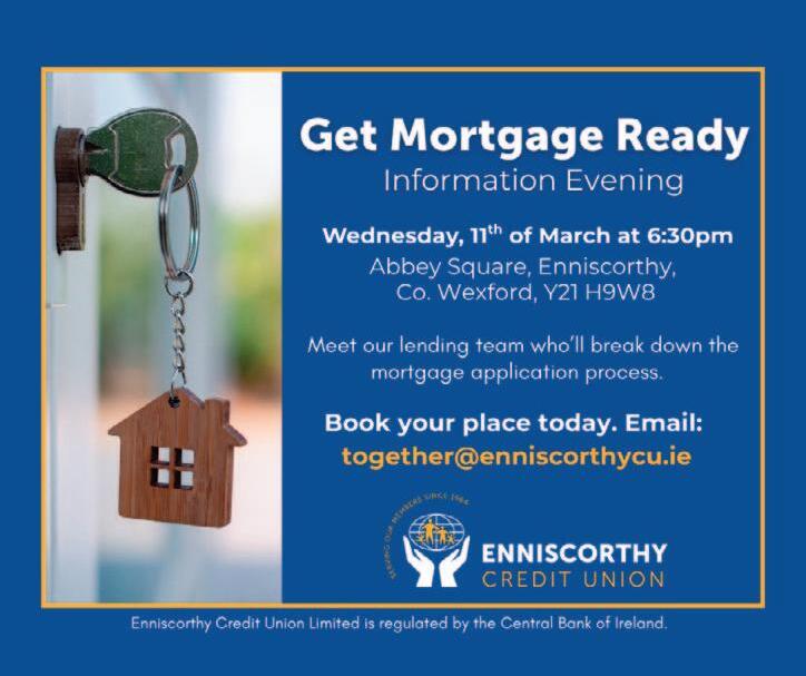 Enniscorthy Credit Union is now doing mortgage lending. It will be holding a ‘Getting Mortgage Ready’ information evening at its Enniscorthy premises on 11th March. See page 13.