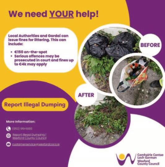 To log a report regarding any dumping, street litter, road oil spills and potholes, ring Wexford Council on (053) 919 6000 or email: customerservice@wexfordcoco.ie