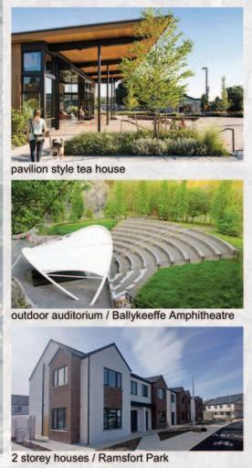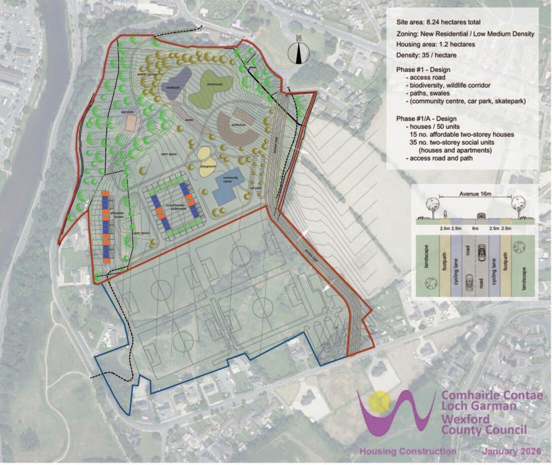 The plan includes 50 new houses (15 Affordable and 35 Social), a community centre, skatepark, amphitheatre, playground, car park, a new road and various pathways running through the site linking to the town, the new Tech Park and Vinegar Hill, and possibly a pavilion style tea house. All the above is subject to receiving government funding. There will be an emphasis on biodiversity and open spaces and maintaining the existing trees on the site.