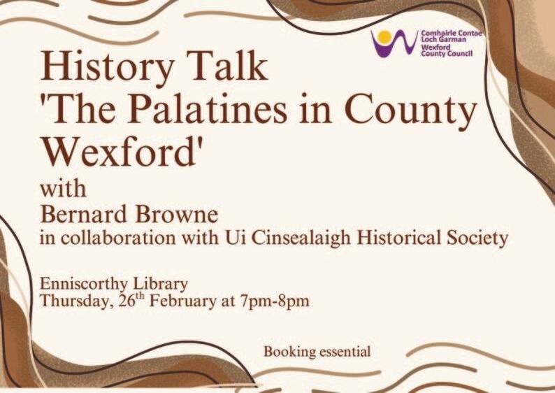 A History Talk entitled 'The Palatines in County Wexford' will take place on on Thursday, 26th February, 7pm8pm, in Enniscorthy Library, in collaboration with Ui Cinsealaigh Historical Society.