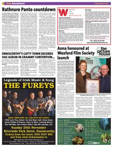 Anna honoured at Wexford Film Society launch The Picture House (Wexford Film Society) has announced that Anna Rackard, two-time IFTA winning production designer, is the recipient of this year’s honorary Fellowship which was presented to Anna at its 2016/17 season programme launch on October 18th in the Wexford Arts Centre. The Fellowship is an annual award presented to a Wexford person who has distinguished themselves in the world of film. Hailing from Killanne, Enniscorthy, Anna is the youngest daughter of the late Betty and legendary Wexford hurler Bobby Rackard. Her latest film, ‘Love & Friendship’ adapted and directed by Oscar nominee Whit Stillman was the highest grossing speciality release in the US this summer and is likely to feature in the end of year awards season. Starring Kate Beckinsale, this Jane Austin adaptation will feature in the line-up for the new season of The Picture House, with the full programme of movies printed below. R a c k a rd j o i n s f e l l o w Wexfordians Billy Roche