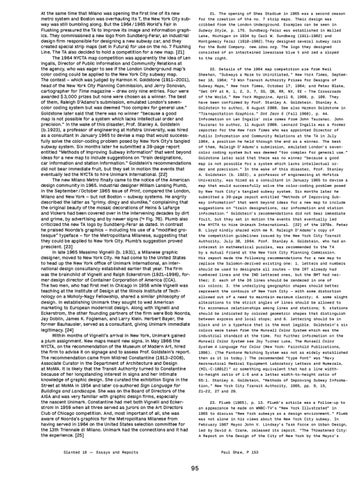 21. The opening of Shea Stadium in 1965 was a second reason for the creation of the no. 7 strip maps. Their design was cribbed from the London Underground. Examples can be seen in Subway Style, p. 175. Sundberg-Ferar was established in Walled Lake, Michigan in 1934 by Carl W. Sundberg (1911–1982) and Montgomery Ferar (1910–1982).They designed several subway cars for the Budd Company. new.idsa.org. The logo they designed consisted of an intertwined lowercase blue t and red a sloped to the right. 22. Details of the 1964 map competition are from Neil Sheehan, “Subways a Maze to Uninitiated,” New York Times, Septem ber 18, 1964; “3 Win Transit Authority Prizes for Designs of Subway Maps,” New York Times, October 17, 1964; and Peter Blake, “Get Off at N, 1, 2, 3, 7, SS, QB, RR, NX, EE – The Crossroads of the World,” New York Magazine, April 8, 1968, p. 108. They have been confirmed by Prof. Stanley A. Goldstein. Stanley A. Goldstein to author, 6 August 2008. See also Harmon Goldstone in “Transportation Graphics.” Dot Zero 5 (Fall 1968), p. 44. Information on Len Ingalls’ role comes from John Tauranac. John Tauranac to author, 11 August 2008. Leonard Ingalls was a former reporter for the New York Times who was appointed Director of Public Information and Community Relations at the TA in July 1964, a position he held through the end as a winner. The best of them, Raleigh D’Adamo’s submission, emulated London’s sevencolor coding system but was deemed “too complex for general use.” Goldstone later said that there was no winner “because a good map is not possible for a system which lacks intellectual order and precision.” In the wake of this disaster, Prof. Stanley A. Goldstein (b. 1923), a professor of engineering at Hofstra University, was hired as a consultant in January 1965 to devise a map that would successfully solve the color-coding problem posed by New York City’s tangled subway system. Six months later he submitted a 39-page report entitled “Methods of Improving Subway information” that went beyond ideas for a new map to include suggestions on “train designations, car information and station information.” Goldstein’s recommendations did not bear immedi ate fruit, but they set in motion the events that eventually led the NYCTA to hire Unimark International. [22] of the 1970s. Peter B. Lloyd kindly shared with me R. Raleigh D’Adamo’s copy of the competition guidelines issued by the New York City Transit Authority, July 30, 1964. Prof. Stanley A. Goldstein, who had an interest in mathematical puzzles, was recommended to the TA by a mutual friend at the New York City Planning Commission. His report made the following recommendations for a new map to replace the Salomon-derived existing one: 1. letters and numbers should be used to designate all routes – the IRT already had numbered lines and the IND lettered ones, but the BMT had neither; 2. each of the 36 lines should be rendered in one of six colors; 3. the underlying geographic shapes should better represent the contours of New York City – with some distortion allowed out of a need to maintain maximum clarity; 4. some slight alterations to the strict angles of lines should be allowed to fix erroneous relationships among lines and stations; 5. stations should be indicated by colored geometric shapes that distinguish between express and local stops; and 6. lettering should be in black and in a typeface that is the most legible. Goldstein’s six colors were taken from the Munsell Color System which was the industrial standard at the time. For further information on the Munsell Color System see Joy Turner Luke, The Munsell Color System A Language for Color (New York: Fairchild Publications, 1996). (The Pantone Matching System was not as widely established then as it is today.) The recommended “type font” was “Navy Aeronautical Medical Equipment Laboratory Letters and Numerals, (MIL-C-18012)” or something equivalent that had a line widthto-height ratio of 1:6 and a letter width-to-height ratio of 65:1. Stanley A. Goldstein, “Methods of Improving Subway Information,” New York City Transit Authority, 1965, pp. 9, 15, 21–22, 27 and 29. 23. Plumb (1965), p. 13. Plumb’s article was a follow-up to an appearance he made on WNBC-TV’s “New York Illustrated” in 1965 to discuss “New York subways as a design environment.” Plumb was not alone in his views about the New York City subway. In February 1967 Mayor John V. Lindsay’s Task Force on Urban Design, led by David A. Crane, released its report. “The Threatened City: A Report on the Design of the City of New York by the Mayor’s