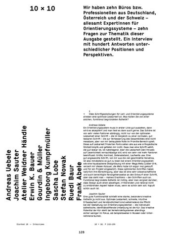 Wir haben zehn Büros bzw. Professionellen aus Deutschland, Österreich und der Schweiz – allesamt ExpertInnen für Orientierungssysteme – zehn Fragen zur Thematik dieser Ausgabe gestellt. Ein Interview mit hundert Antworten unter- schiedlicher Positionen und Perspektiven.