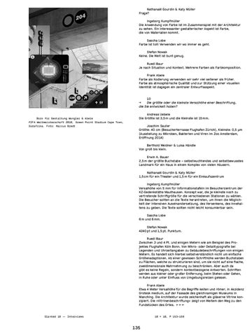 Nathanaël Gourdin & Katy Müller Frage? Ingeborg Kumpfmüller Die Anwendung von Farbe ist im Zusammenspiel mit der Architektur zu sehen. Ein interessanter gestalterischer Aspekt ist Farbe, die von Materialien kommt. Sascha Lobe Farbe ist toll! Verwenden wir wo immer es geht. Stefan Nowak Keine. Die Welt ist bunt genug. Ruedi Baur Je nach Situation und Kontext. Mehrere Farben als Farbkomposition. Frank Abele Farbe als Kodierung verwenden wir sehr viel seltener als früher. Farbe als atmosphärische Qualität und zur Stützung einer visuellen Identität ist dagegen ein zentraler Entwurfsaspekt. 10 � Die größte oder die kleinste Versalhöhe einer Beschriftung, die Sie entwickelt haben?