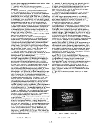 � Das heißt, ihr seid durchaus in der Lage, eure Schriften auch abseits von Print einzusetzen, z. B. auf Mobile Devices etc? Ja, absolut, und das ist definitiv auch mein persönlicher Anspruch. Es sollten nicht nur die formalen Aspekte geklärt und sauber ausformuliert sein, sondern auch die technischen Anforderungen genau in Augenschein genommen werden. � Nebenbei unterrichtest Du als Gastdozent an der Staatlichen Hochschule für Gestaltung Karlsruhe. Warum bist du hier und nicht in Berlin? Gute Frage. Vielleicht wäre der Weg in Berlin zu kurz zwischen Hochschule und Büro (Lachen). Ehrlich gesagt weiß ich nicht mehr genau, wie das zustande kam. Ich kenne Urs Lehni und Chris Rehberger, die dort beide seit zwei Jahren Professoren sind, und ich glaube, meine Stelle kam über eine Empfehlung. � Was genau lehrst du in deinem Unterricht? Am Anfang habe ich Grundlagen unterrichtet, seit letztem Semester nun Schriftgestaltung. Ich unterrichte aber keine klassische Schriftgestaltunglehre, wie man es z. B. aus den Niederlanden kennt. Ich lehre kein Dogma und diktiere niemandem, welches Medium er zu benutzen bzw. zu bearbeiten hat, z. B. drei Wochen mit der Feder schreiben üben, etc. – jeder soll arbeiten, wie er möchte. Es geht mir vielmehr um die Beschäftigung und Auseinandersetzung mit Schrift im weitesten Sinne. Ein interessanter, konzeptioneller Ansatz ist mir dabei viel wichtiger, als die Erfüllung und Einhaltung von Regeln und Dogmen. Die Studenten sollen selbständig eine passenden Ansatz für sich erarbeiten und dabei die nötige Leidenschaft entwickeln. � An welchen Projekten arbeitest du aktuell? Wie schon gesagt, arbeite ich momentan an der Maison Neue, die im Gegensatz zur alten mehr optische Feinheiten beinhalten wird, die einer klassischen Grotesk entsprechen. Die Buchstaben sind in sich harmonischer, weniger konstruiert. Natürlich verliert sie dadurch ein wenig Charakter – man wird sehen, ob das positiv oder eher negativ ist. Vor allem wird sie in sehr vielen Schnitten erhältlich sein: fünf stehende Schnitte, dazugehörige Italics, und zusätzliche stilistische Optionen wie Monospaced und Schulbuch. � Wie geht es sonst so mit Deinem Leben weiter? Mit dem Büro bin ich nach wie vor sehr selektiv, was Gestaltungs aufträge angeht – selektiv vor allem im Sinne der Wirtschaftlichkeit. Ich möchte weiterhin den Fokus auf Schriftgestaltung und MilieuGrotesque legen und hoffentlich weiter unterrichten. Diese Kombination macht mir sehr viel Spaß und passt auch gut zu meinem Leben. Wobei ich in Zukunft auch gerne weniger arbeiten würde – wie Alle (Lachen). Ich habe erst in den letzten Jahren gelernt, mich zu entspannen und auch mal Abends genussvoll nach Hause gehen zu dürfen, ohne mich mit Gestaltung zu beschäftigen. Ich schätze, irgendwann begreift man, dass Freizeit ein sehr wichtiger Teil der Arbeit ist. � Dem hab’ ich nichts hinzuzufügen! Vielen Dank für deinen Besuch.