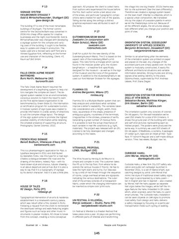 p 14 Falls Creek Alpine Resort Wayfinding Buro North, Melbourne (AU) buronorth.com The Falls Creek Alpine Resort required the development of a wayfinding system to help visitors navigate the complex ski resort. The designed system needed to be an environmentally conscious solution to match the resort’s claim as the first alpine-based organization to be benchmarked by Green Globe 21: the international certification program for sustainable tourism. A modular system of sign types was created to provide information in a wide variety of directions to suit the complex village layout. The design of the sign system aims to promote the highest possible visibility of information while retaining the smallest presence of supporting structure. Photography: Daniel Colombo. 2010.