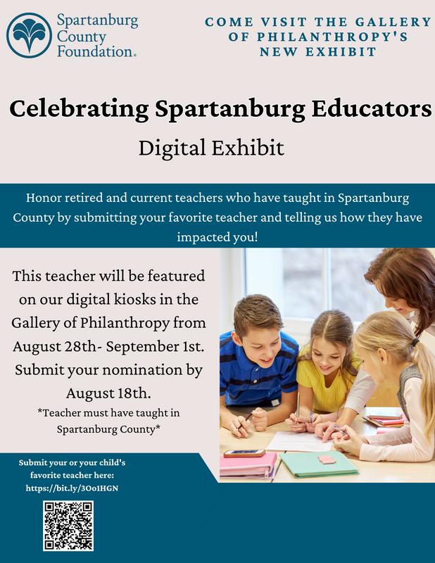 Upcoming Gallery Exhibit Honor past and current teachers who have taught in Spartanburg County by submitting your favorite teacher and tell us how they have impacted you! Teachers will be featured on the Gallery of Philanthropy kiosks August 28th - September 1st. * Teachers must have taught in Spartanburg County* Nomination Form: https://form.jotform.com/231714546332149