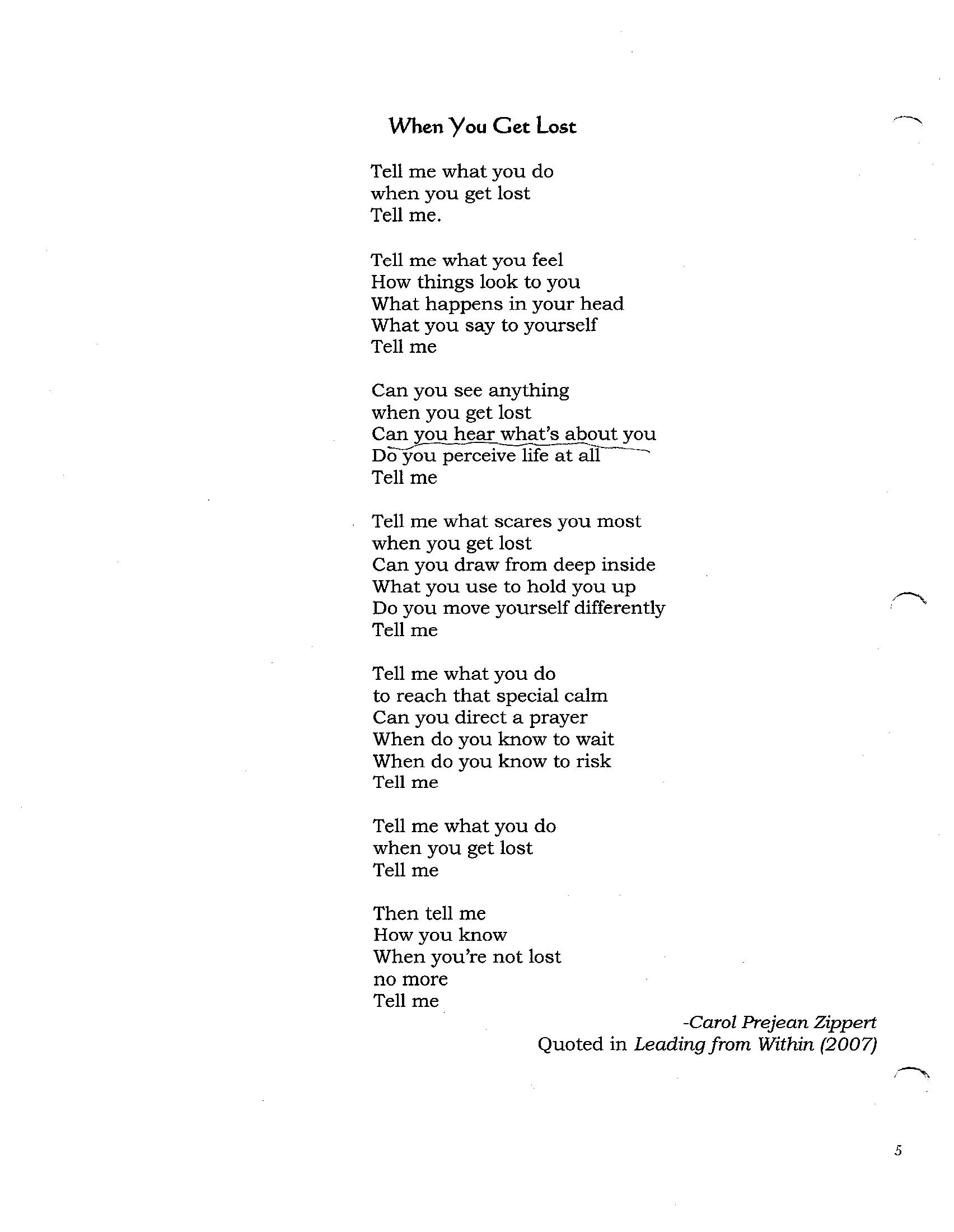 settings, the Courage to Lead® retreat explores important topics metaphorically, using poems and stories that embody the topic. Palmer calls these embodiments “third things” because rather than representing the voice of the facilitator or participant, they have “voices of their own, voices that tell the truth about a topic” and evoke from us what our authentic or deeper self wants us to pay attention to.