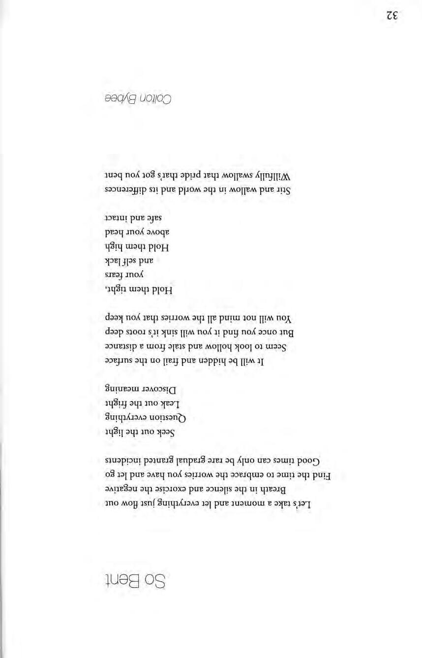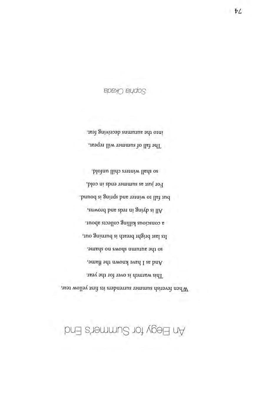An Elegy for Summer's End ....... . ....... . . . ... .. .... .. ........ 74 Sophia Okada Man ........................................................75 Eva Andrews Down on All Fours .............................................76 Kimi Farley City Man ....................................................78 Eva Andrews Reflections ......... .. ...... . .... . ............................79 Kelly Corbray Barney Rubble's All Seeing Eye ......... . .. .. ................... .80 Jill Flanagan The Jacob Langston 81 Max Johnson 6 Fleeting Cowboys ..................... . ...................... 82 Alysia LeFevre Le Reve 83 Franklin Timpson Erased/Disclosed pt. 1 84 Ivan de Monbrison Death of a Homeless Man 85 John Nelson Unknown Progression 86 Aaron McCoy Inevitability 87 Christina Vidal A Cry to Existence .................... . ................ ... ..... 88 Irina Choi Signs of Life ..................... . .. .. ......... . ... .. ...... .. .90 Alexis Nelson Leaves Fall 92 McKell Hadlock Pretty, Gay 93 Maryam Johnson Five Mile Pass 94 Lindsay Daniels We Could Be Seen Inhaling Together ................... . ........ .. 95 Gary Howard Glenn, Party of One-Third 96 Emily Beck Master 98 Sherrie Hogan I Wait ... ................................ . .......... . ...... .. 99 Robin Glassey VII