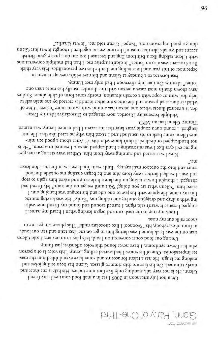 Now I was scared and running away from him. Others were staring at me , giving me evil eyes like I was mistreating a handicapped person. I wanted to scream , " He is not handicapped or disabled . I don't know who this is!" After about a good ten minutes Glenn came back to his usual self and I asked him why he acted like that. He just laughed . I found out a couple years later that his accent I had named Lenny, was named Timmy. Glenn had an MPD.