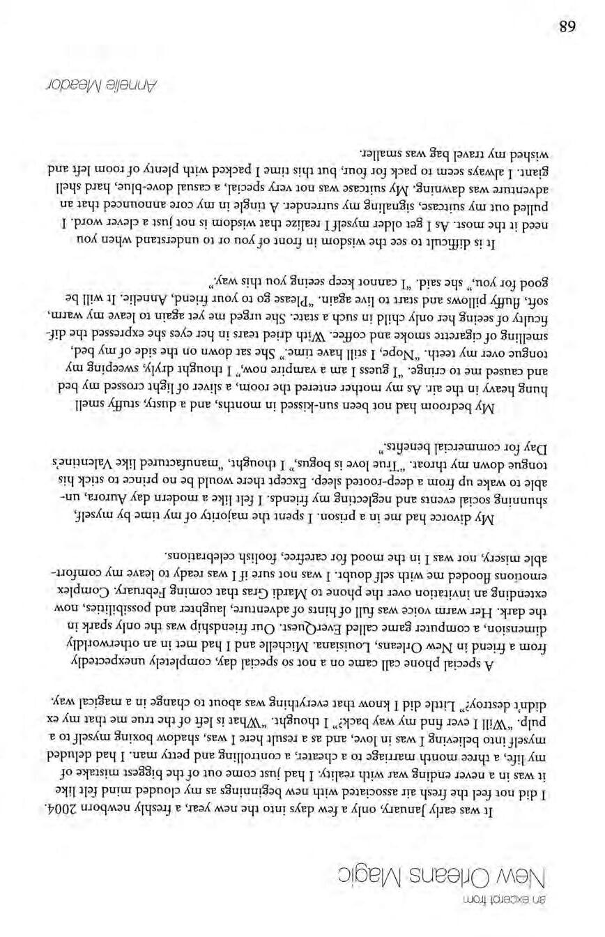 She closed her eyes and thought of the time they visited a beach while on vacation in California. It was cloudy, windy, and cold. The forecast called for scattered showers. It was by no means the picturesque California beach weather they had imagined . But they had walked along the shore, anyway, exploring tide pools and even a separate little beach you could get to if the tide was low enough. The tide was indeed low enough , but only if you were quick enough . Margot immediately jumped at the chance to beat the swiftness of the waves, but her opportunity was shot down b y a thunderous crash and the taste of salt water in her mouth. She didn't even have time to scream. The water receded to reveal her clothes covered in sand - pants , shirt, undershirt, jacket, underwear, all of it . They laughed and laughed, and the sounds of their laughter echoed off the rocks and jagged cliffs surrounding them, coming back into their mouths as if recycling them. And soon Abby realized she was only laughing to shake the fear of Margot being carried out impossibly far from shore , from her.