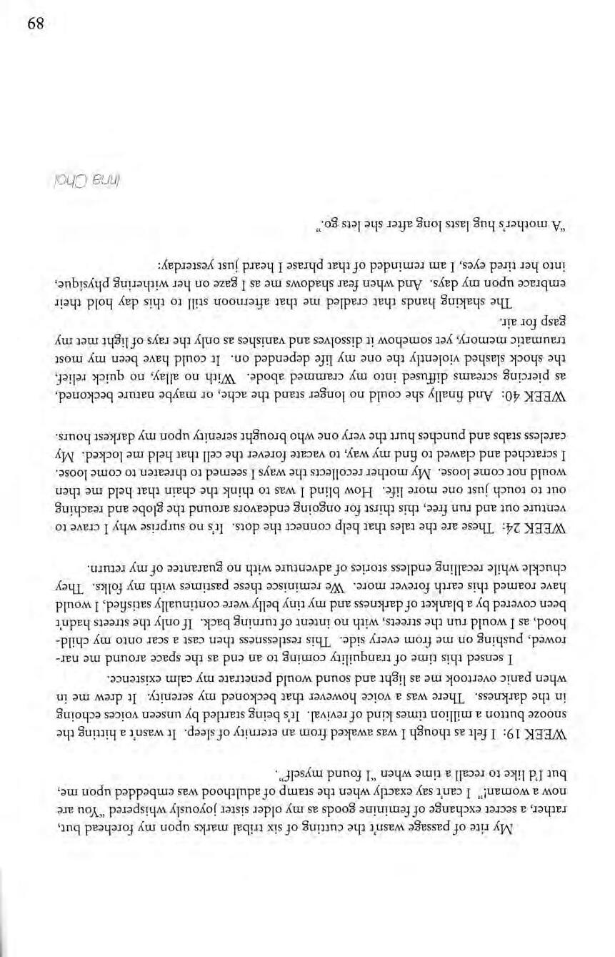 WEEK 24: These are the tales that help connect the dots. It 's no surprise why I crave to venture out and run free , this thirst for ongoing endeavors around the globe and reaching out to touch just one more life How blind I was to think the chain that held me then would not come loose. My mother recollects the ways I seemed to threaten to come loose. I scratched and clawed to find my way, to vacate forever the cell that held me locked. My careless stabs and punches hurt the very one who brought serenity upon my darkest hours.