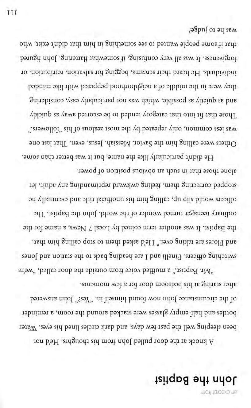"Mr. Baptist," a muffled voice from outside the door called, "we're switching officers . Pinelli and I are heading back to the station and Jones and Flores are taking over." He'd asked them to stop calling him that, the Baptist. It was another term coined by Local 7 News, a name for the ordinary teenager turned wonder of the world. John the Baptist. The officers would slip up, calling him his unofficial title and eventually he stopped correcting them, feeling awkward reprimanding any adult, let alone those that in such an obvious position of power.