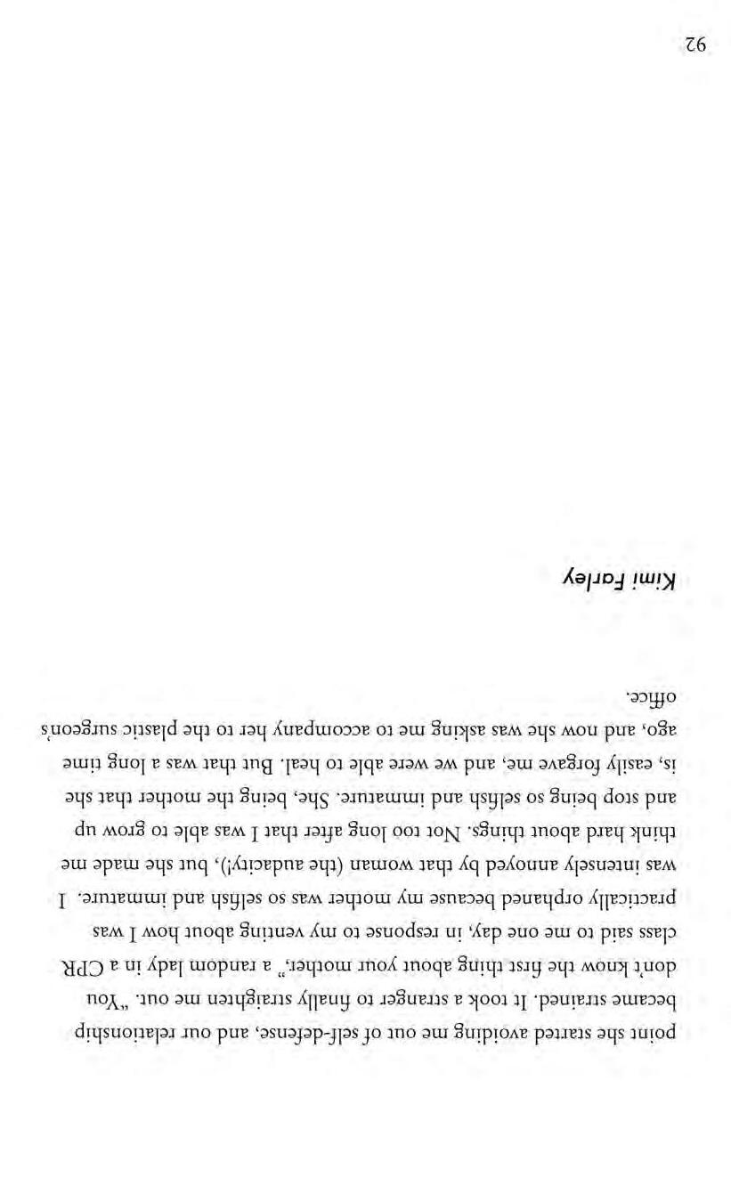point she started avoiding me out of self-defense, and our relationship became strained. It took a stranger to finally straighten me out. "You don't know the first thing about your mother," a random lady in a CPR class said to me one day, in response to my venting about how I was practically orphaned because my mother was so selfish and immature. I was intensely annoyed by that woman (the audacity!), but she made me think hard about things. Not too long after that I was able to grow up and stop being so selfish and immature. She, being the mother that she is, easily forgave me, and we were able to heal. But that was a long time ago, and now she was asking me to accompany her to the plastic surgeon's office.