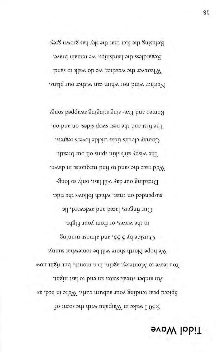 The waves in your body can no longer abide your keeping the time the planets or stars For it now found the key which would justify their fixed positions. Your toes combing grass And the light.