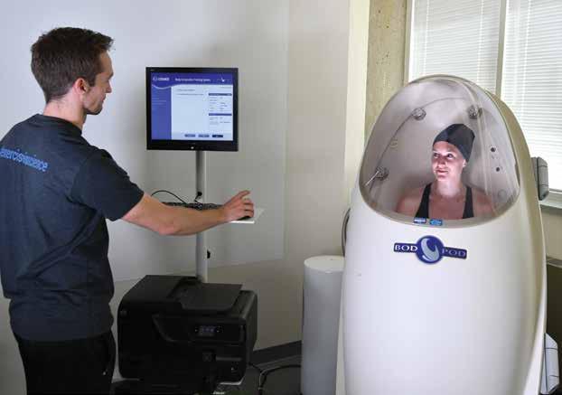 Exercise science majors Jefferson Brewer, left, and Jenny Gordon demonstrate the BodPod to assess body composition for health and performance.