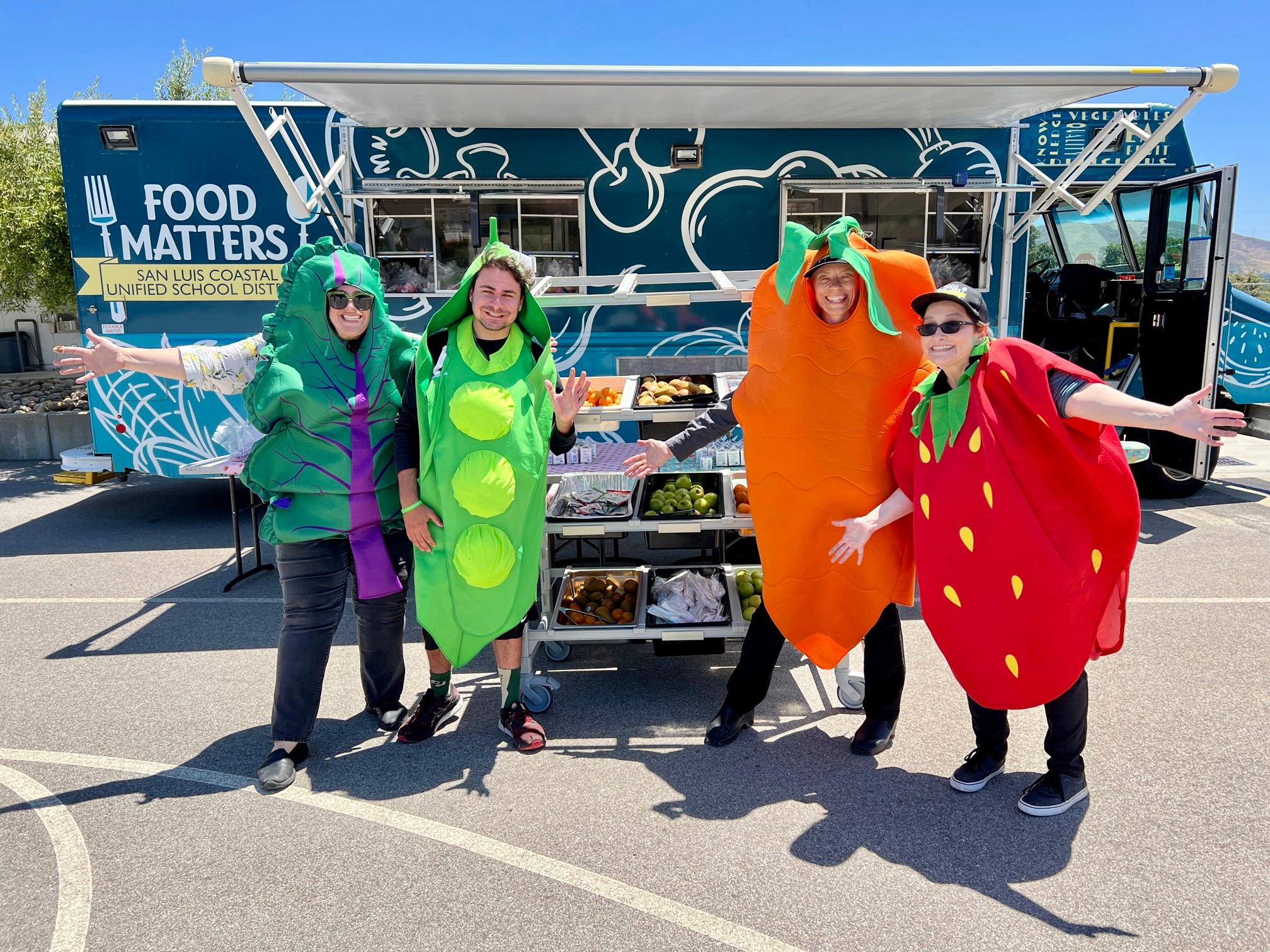 Fotografiadoarriba:ErinPrimer(DirectoradeServiciosde AlimentosyNutrición)disfrazadadeKALE,Jack(Ayudantede BP)comoGUISANTEDULCE,AnneWilson(Coordinadorade Nutrición)comoZANAHORIA,yStephanieMacias(Trabajadora deServiciosdeAlimentosII)comoFRESAennuestroseventos depicnicdecamionesdecomidadeprimaria(fototomada enlaescuelaprimariaBishop'sPeak)