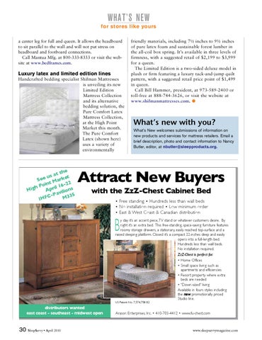 friendly materials, including 7½ inches to 9½ inches of pure latex foam and sustainable forest lumber in the all-coil box spring. It’s available in three levels of firmness, with a suggested retail of $2,199 to $3,999 for a queen. The Limited Edition is a two-sided deluxe model in plush or firm featuring a luxury tack-and-jump quilt pattern, with a suggested retail price point of $1,499 in queen. Call Bill Hammer, president, at 973-589-2400 or toll-free at 888-744-3626, or visit the website at www.shifmanmattresses.com. ●