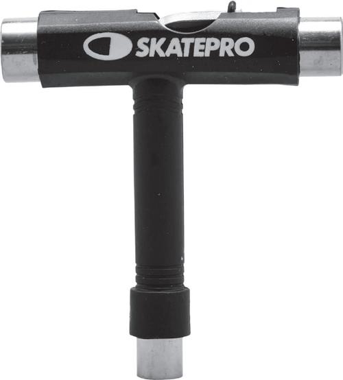 Apresentamos a clássica ferramenta de skate com tudo o que você precisa para manter sua configuração firme. Ferramenta preta com o logotipo da Skatepro na parte superior. Inclui: soquete hexagonal de 3/8" (10mm) para parafusos de caminhão, soquete hexagonal de 1/2" (13mm) para porcas de eixo, soquete hexagonal de 9/16" (14mm) para pino rei do caminhão, chave allen de 3mm com cabeça Phillips na extremidade oposta.