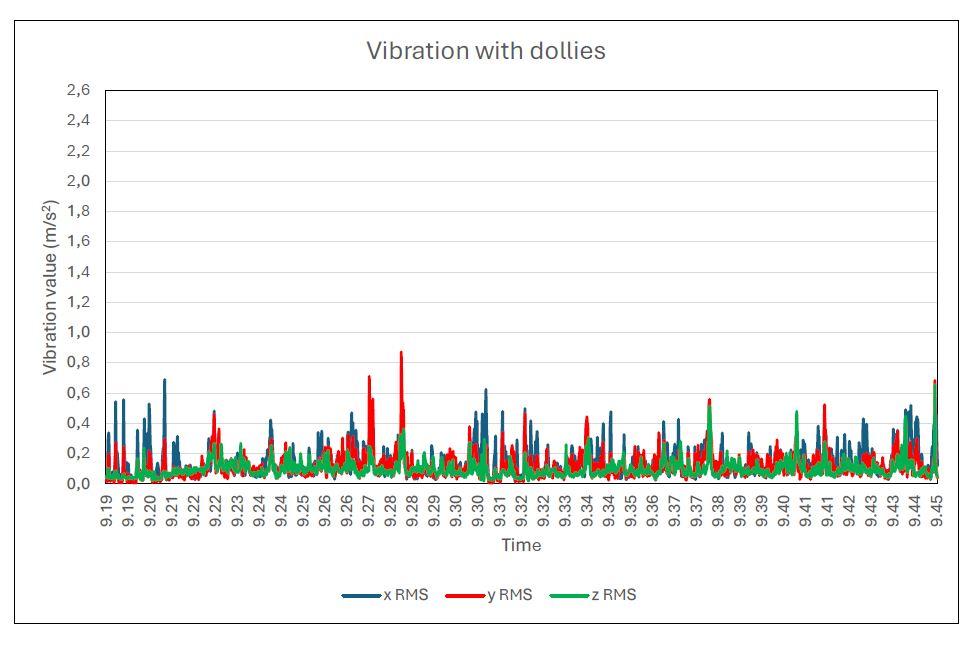 When driving on transport wheels, the highest average vibration acceleration is 0.23 m/s2 which was measured in the driver’s front-facing direction (forwards–backwards direction). At the measured level of vibration acceleration, neither the action value nor the limit value are exceeded during a normal 12-hour working day.