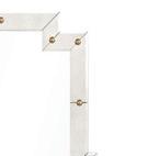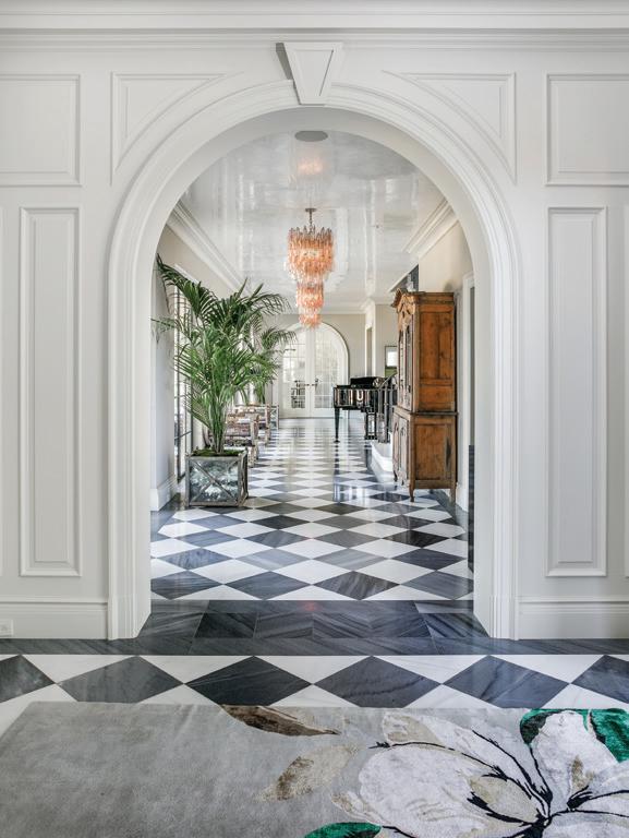 Heightening the drama of the space, Bolen combined a beautiful bronze and jewel chandelier with black, gray and white marble floors. A French contemporary lamp and new artwork bring a fresh feel to the design, while a magnolia-themed Vivienne Westwood rug adds intrigue.