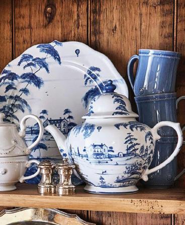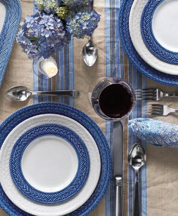 WE’VE ARRIVED IN SUMMER, and what could be more romantic than a garden party? Find a small nook in your backyard (or front, for that matter!) under a tree, on the patio … really anywhere will do. If you don’t have an actual garden, you can create one on your table. As a matter of fact, that’s something you should do even if you are in a garden. Wild, unruly flowers are perfect for this type of setting. Use flowers with “bendy” stems like anemones or poppies, and long varieties like delphinium or larkspur will add height. Simple tulips can add interest by (very carefully!) turning the petals inside out. Layer in your tabletop — the more whimsical, the better. Pick a color scheme and stick to it, coupling the flowers and the wares. Try a monochromatic look for a more contemporary feel, and if you have a blue tabletop, lean into the blue and violet hues of flowers.