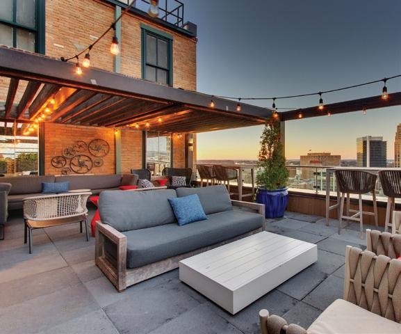 Food and drink at the Elyton celebrate fl avors of the South. The Yard restaurant rotates a seasonal menu, although the popular Cornish hen and fried okra are almost always available. On a breezy summer eve, head upstairs and outside to fi nd Moonshine, the rooftop bar that serves up small plates and craft cocktails. Try the signature cocktail, “The Lady in the Moon,” inspired by the female faces incorporated into the Empire Building’s architecture; they’re easy to admire from patio seats. Sip this pleasing mix of rosemary, prosecco, lemon, simple syrup and gin while you soak in the downtown Birmingham skyline. It’s a great way to top off your visit — and it just may have you toasting to the Elyton Hotel, where new and old live together beautifully.