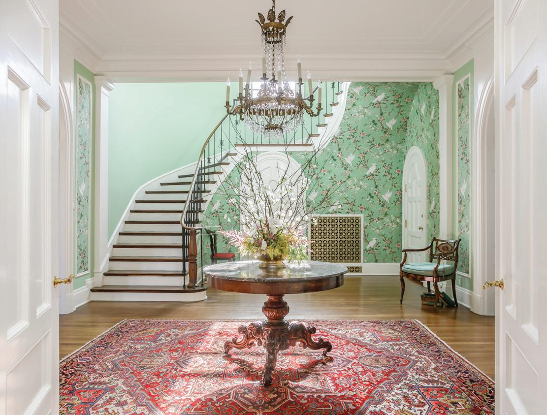 The room’s archived wallpaper, “Kanchou” by Brunschwig & Fils, encapsulates that special feeling, and thoughtful details such as this were incorporated into the entry design to honor the timelessness of the home.