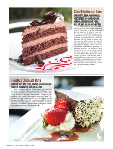 Chocolate Mousse Cake LA BAGUETTE, 924 W. MAIN, NORMAN, 405.329.5822, 1130 RAMBLING OAKS, NORMAN, 405.329.1101, AND 7408 N. MAY AVE., OKC, 405.840.3047 (BISTRO)