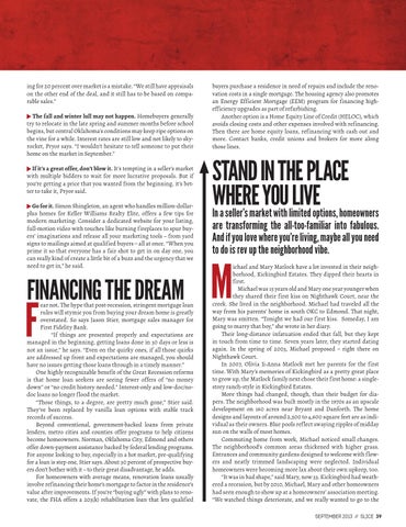 ichael and Mary Matlock have a lot invested in their neighborhood, Kickingbird Estates. They dipped their hearts in first. Michael was 15 years old and Mary one year younger when they shared their first kiss on Nighthawk Court, near the creek. She lived in the neighborhood. Michael had traveled all the way from his parents’ home in south OKC to Edmond. That night, Mary was smitten. “Tonight we had our first kiss. Someday, I am going to marry that boy,” she wrote in her diary. Their long-distance infatuation ended that fall, but they kept in touch from time to time. Seven years later, they started dating again. In the spring of 2003, Michael proposed – right there on Nighthawk Court. In 2007, Olivia Ji-Anna Matlock met her parents for the first time. With Mary’s memories of Kickingbird as a pretty great place to grow up, the Matlock family next chose their first home: a singlestory ranch-style in Kickingbird Estates. More things had changed, though, than their budget for diapers. The neighborhood was built mostly in the 1970s as an upscale development on 160 acres near Bryant and Danforth. The home designs and layouts of around 2,500 to 4,600 square feet are as individual as their owners. Blue pools reflect swaying ripples of midday sun on the walls of most homes. Commuting home from work, Michael noticed small changes. The neighborhood’s common areas thickened with higher grass. Entrances and community gardens designed to welcome with flowers and neatly trimmed landscaping were neglected. Individual homeowners were becoming more lax about their own upkeep, too. “It was in bad shape,” said Mary, now 33. Kickingbird had weathered a recession, but by 2010, Michael, Mary and other homeowners had seen enough to show up at a homeowners’ association meeting. “We watched things deteriorate, and we really wanted to go to the SEPTEMBER 2013 // SLICE 39