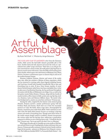 THE CLICK AND CLAP OF CASTANETS echo from the flamenco studio, while across the hall ballet dancers gracefully plié at the barre. Further down the hall, dancers sail across the room in a specialized class called “Leaps and Turns.” Next door, in an old gas station converted into a dance studio, the walls pulse to hip-hop beats as dancers match moves with music. Even the lobby of Everything Goes Dance Studio, which opens onto 16th Street in Oklahoma City’s Plaza District, becomes a performance space as dancers skip in and out of the studios between classes. Shannon Calderon Primeau, director and owner of the studio since 1995, offers her students a lifetime of dance experience, which she has mastered in training under dance legends including Jimmie and Carol Ann Crowell (who founded Crowellsville USA in 1960 and Everything Goes in 1976), El Arca, Patsy Swayze (mother of actor/ dancer Patrick Swayze), Lydia Torea, Jose Junco and Adela Clara. In her 20-plus years of professional dancing, she has performed throughout the nation with the likes of Oklahoma’s own Edgar Cruz, as well as the late guitar master Ruben Romero. Primeau, along with her faculty of master teachers, offers classes in ballet, pointe, jazz, tap, hip-hop, modern, flamenco, Latin and Mexican folkloric dance. “No matter what your background is, anyone can come here and dance,” Primeau says. During the 1980s, inspired by the famous Latin musical group Menudo, Primeau started a similar performance group with her brothers Mark and Ernesto. Mark went on to form the successful musical act Color Me Badd, whose stage show, choreographed by Ernesto, toured for years with Paula Abdul. Mark continues to tour with Color Me Badd while Ernesto focuses on teaching 13 hip-hop classes each week at Everything Goes. Though most dance forms at the studio remain deeply rooted in tradition, Ernesto incorporates the various styles into his hip-hop class, embracing a postmodern potpourri to define an ever-evolving dance style. “I would do this for free,” Ernesto says, “but to get paid to do what I love is a blessing.” What began decades ago in a humble one-room studio at May Avenue and 36th Street is now a bustling hub of talent with more than 400 dancers. Primeau proudly continues a beloved artistic family tradition begun by her parents – pioneers in Oklahoma City’s Hispanic community. The Calderons founded KZUE “La Tremenda Radio Mexico” – the 90 SLICE // MARCH 2013