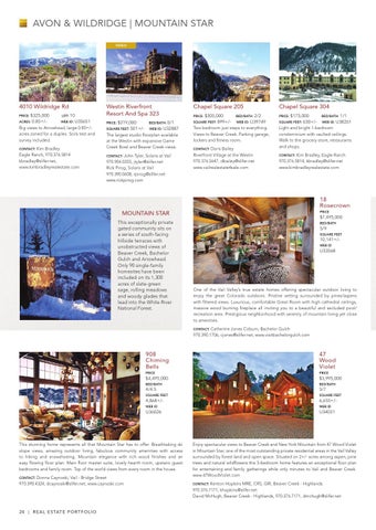 18 Rosecrown MOUNTAIN STAR This exceptionally private gated community sits on a series of south-facing hillside terraces with unobstructed views of Beaver Creek, Bachelor Gulch and Arrowhead. Only 90 single-family homesites have been included on its 1,300 acres of slate-green sage, rolling meadows and woody glades that lead into the White River National Forest.