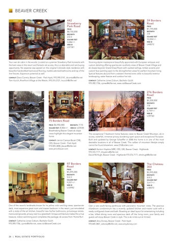 Stunning alpine masterpiece beautifully appointed with European antiques and custom detailing offering spectacular southerly views of Beaver Creek Village and ski slopes beyond. Grand Great Room with vaulted ceilings, timber accents and custom faux painting open to the dining/kitchen areas for perfect mountain living. Special features abound from a western themed wine cellar to beautiful exterior landscaping, water feature and outdoor hot tub. Contact: Catherine Jones Coburn, Bachelor Gulch 970.390.1706, cjones@slifer.net, www.visitBeaverCreek.com