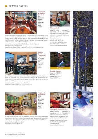 Exceptional location, exceptional lifestyle, Ironwood in Beaver Creek has everything you’ve been looking for. This ski-in/ski-out 5-bedroom residence features panoramic views of Beaver Creek Mountain and has been completely remodeled with the finest finishes and fixtures available as well as a designer furniture package and airconditioning. www.IronwoodBeaverCreek.com Contact: Kenton Hopkins MRE, CRS, GRI, Beaver Creek - Highlands 970.376.7171, khopkins@slifer.net David McHugh, Beaver Creek - Highlands 970.376.7171, dmchugh@slifer.net
