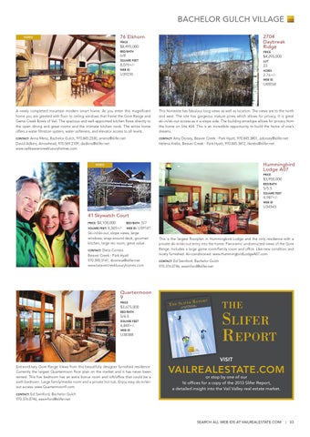 Contact: Anna Menz, Bachelor Gulch, 970.845.2330, amenz@slifer.net David Adkins, Arrowhead, 970.569.2109, dadkins@slifer.net www.vailbeavercreekluxuryhomes.com