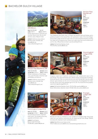 Perfect combination of Gore Range views, great floorplan, amenities, highend finishes; ski-in/ski-out. Contact: Catherine Jones Coburn Bachelor Gulch, 970.390.1706 cjones@slifer.net www.visitbachelorgulch.com