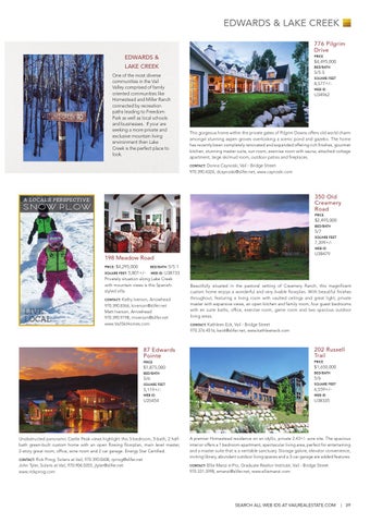 Privately situation along Lake Creek with mountain views is this Spanishstyled villa. Contact: Kathy Iverson, Arrowhead 970.390.8366, kiverson@slifer.net Matt Iverson, Arrowhead 970.390.9198, miverson@slifer.net www.VailSkiHomes.com
