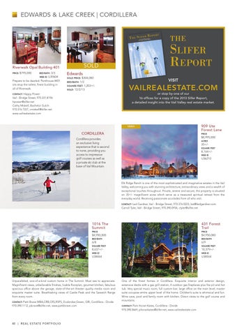 Prepare to be dazzled. Penthouse #401 sits atop the tallest, finest building in all of Riverwalk. Contact: Happy Power Vail - Bridge Street, 970.331.8196 hpower@slifer.net Cathy Miskell, Bachelor Gulch 970.376.7227, cmiskell@slifer.net www.vailrealestate.com