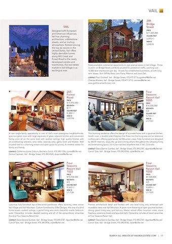 VAIL Designed with European and American influences, Vail has charming architecture, cobblestone streets, and an inviting atmosphere. Ranked among the top ski resorts in the United States, Vail offers highly desirable homes along Mill Creek and Forest Road to the newly developed condos and townhomes, the real estate market in Vail Village is as exciting as ever.