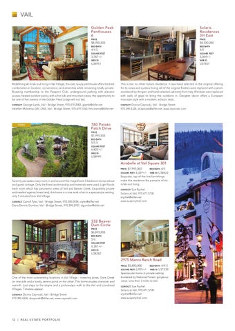 Spectacular home in private setting bordered by National Forest; gorgeous views. Less than 3 miles to Vail. Contact: Sue Rychel Solaris at Vail, 970.477.5730 srychel@slifer.net www.susanrychel.com