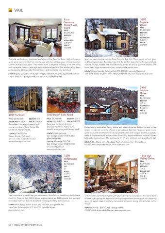 Spacious new construction on Gore Creek in East Vail. The tranquil setting, highend finishes and open floorplan make this the perfect alpine home. Features include vaulted ceilings, marble and wood flooring, zoned a/c and a gourmet kitchen. The home has a large recreational room, a study and a media room. Contact: Steve Stavisky, Solaris at Vail, 970.390.9203, sstavisky@slifer.net Tom Jaffe, Solaris at Vail 973.747.7009, tjaffe@slifer.net, www.noplacelikevail.com