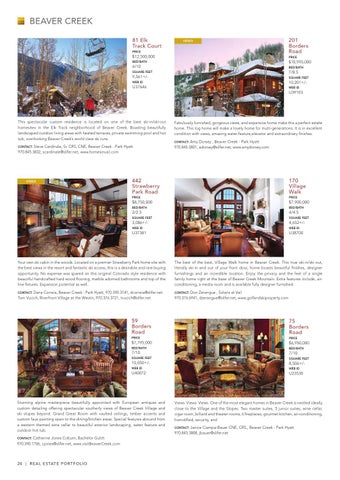 This spectacular custom residence is located on one of the best ski-in/ski-out homesites in the Elk Track neighborhood of Beaver Creek. Boasting beautifully landscaped outdoor living areas with heated terraces, private swimming pool and hot tub, overlooking Beaver Creek’s world class ski runs. Steve Cardinale, Sr. CRS, CNE, Beaver Creek - Park Hyatt 970.845.3832, scardinale@slifer.net, www.homesinvail.com Contact: